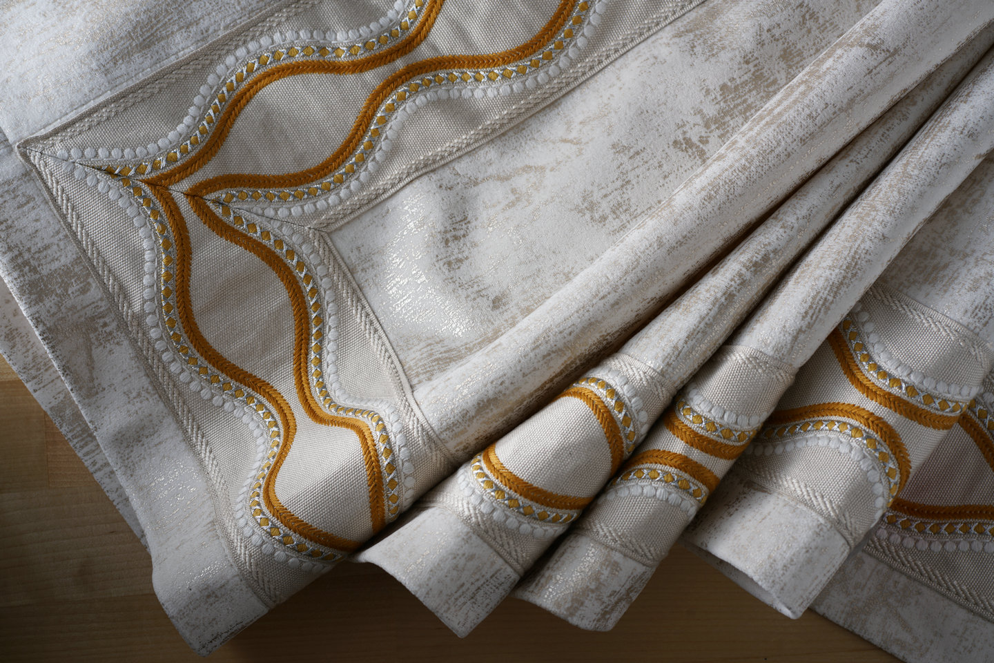 以人棉為主要原料,呈現(xiàn)啞光的、柔軟的感覺,再加上一點點的金線,仿佛在平靜的水面上,波光粼粼的動感。